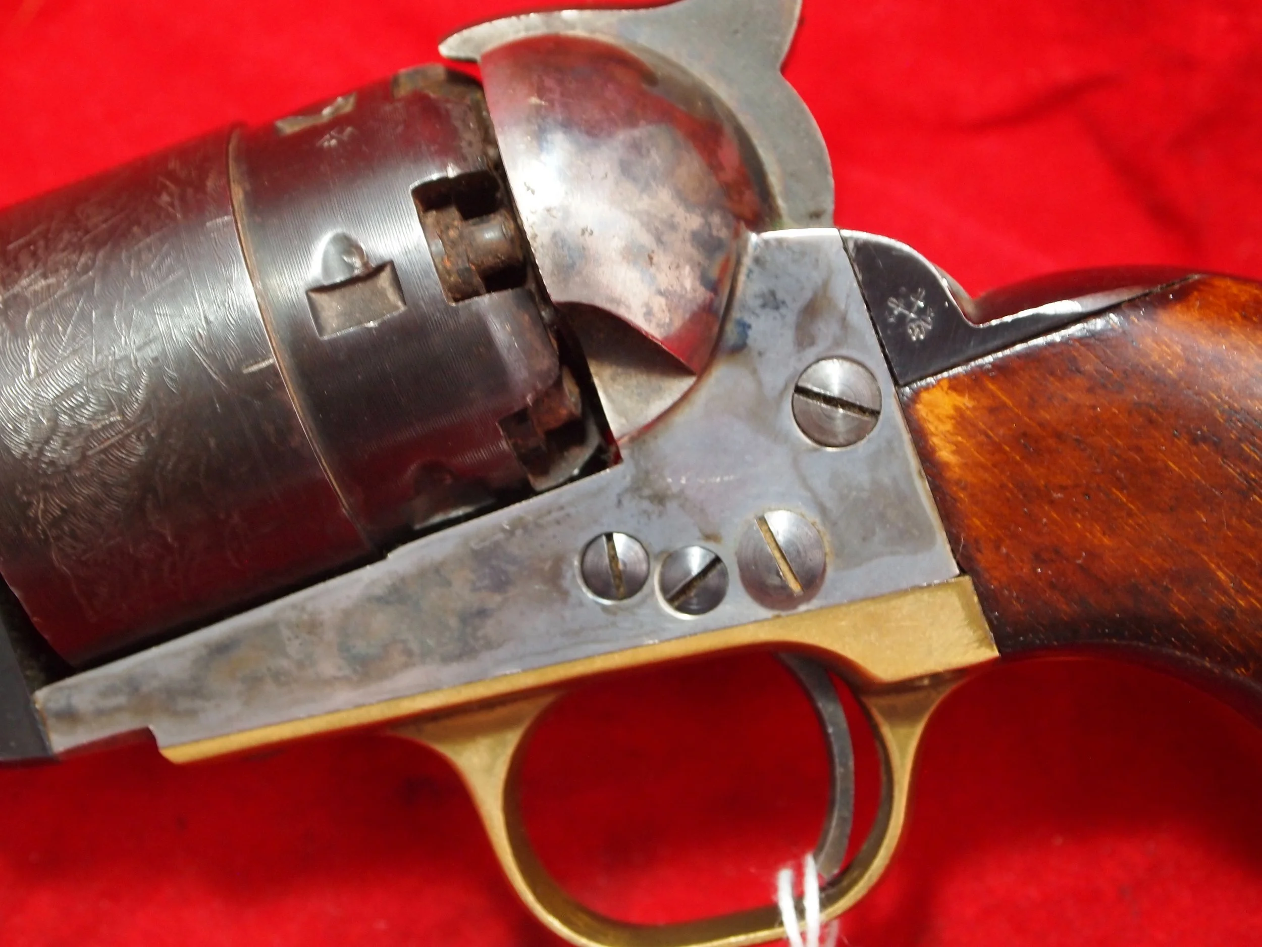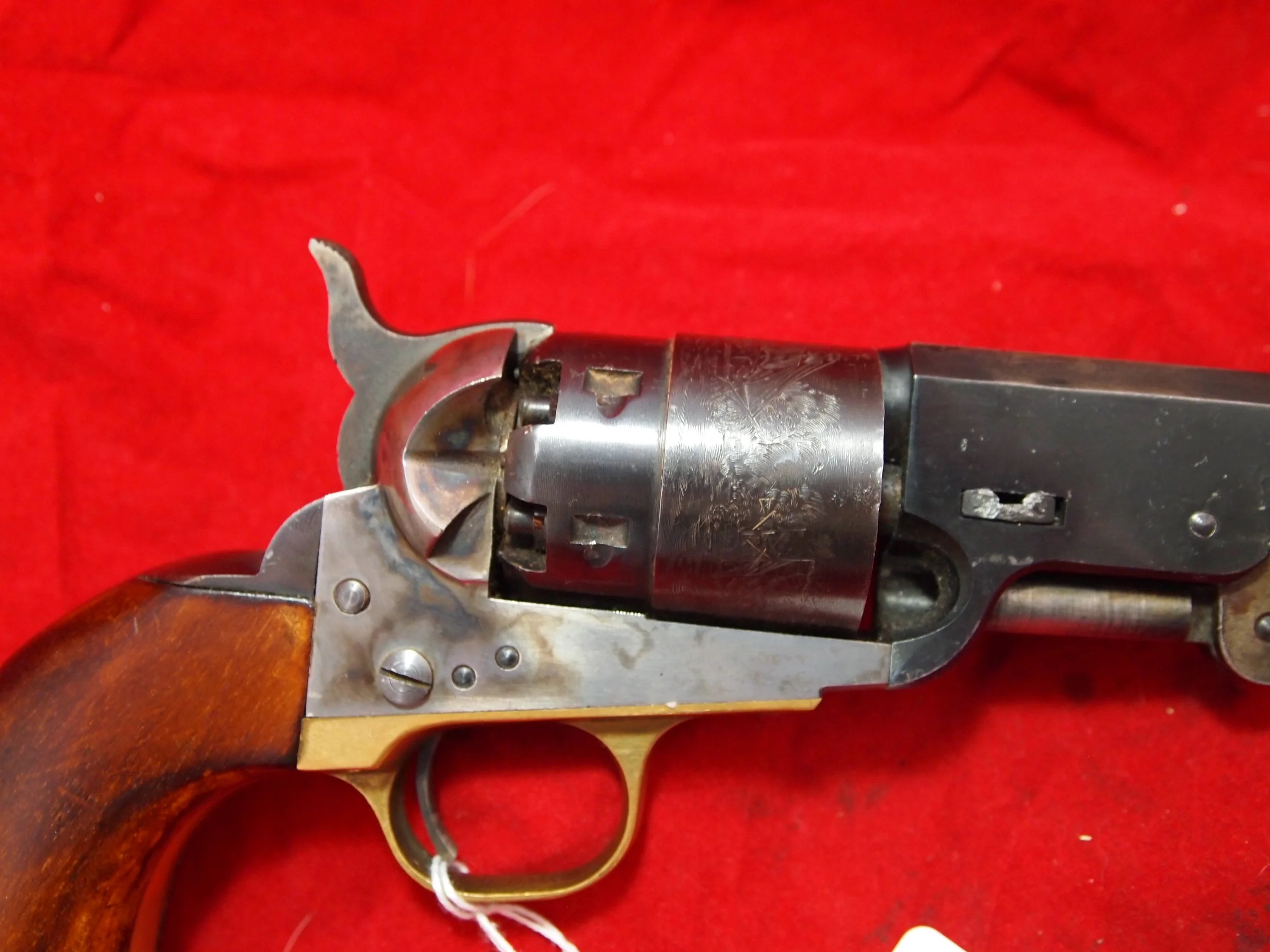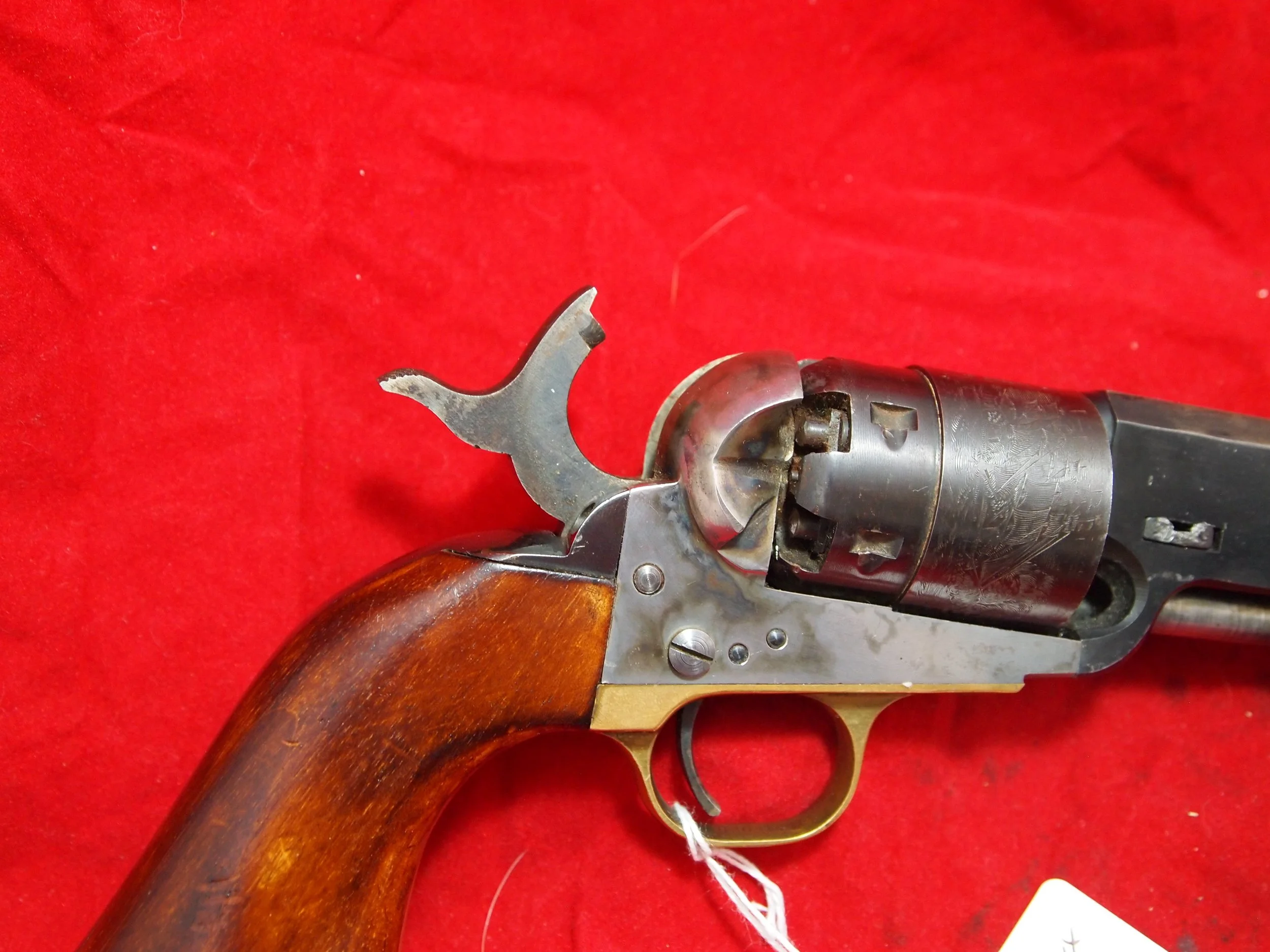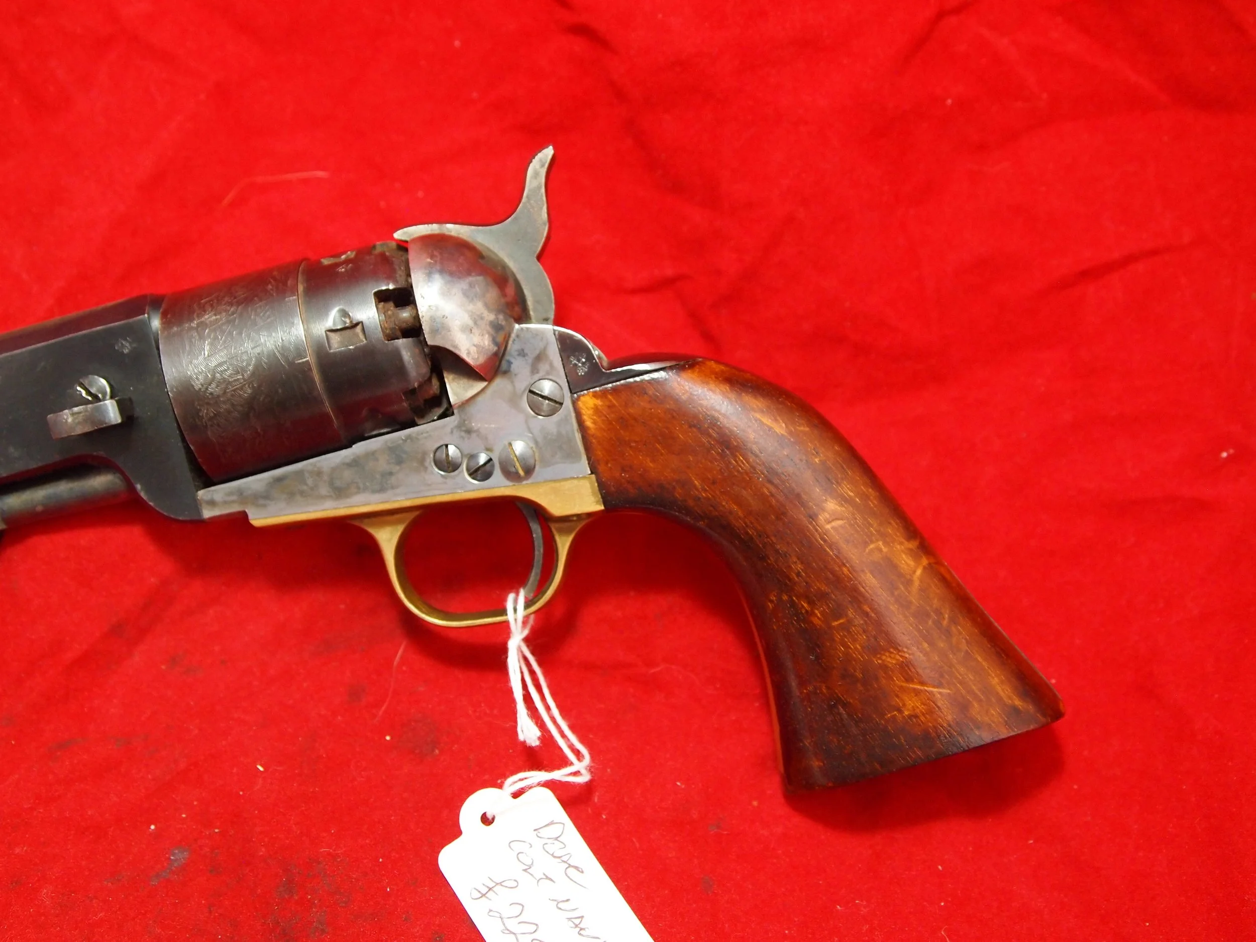 A steel framed deactivated replica of a Colt Navy. It is an older the action cocks and dry fires. The cylinder turns correctly when you cock the hammer, but it does not index very positively and the cylinder can rotate a little as the hammer drops. It has the cutaway and extended screw for the fitment of a stock. With certificate.