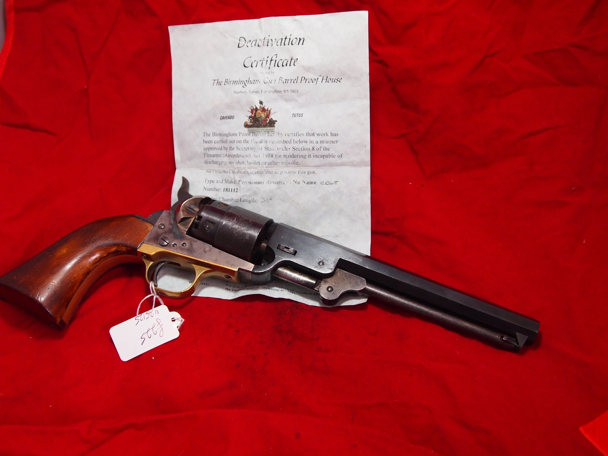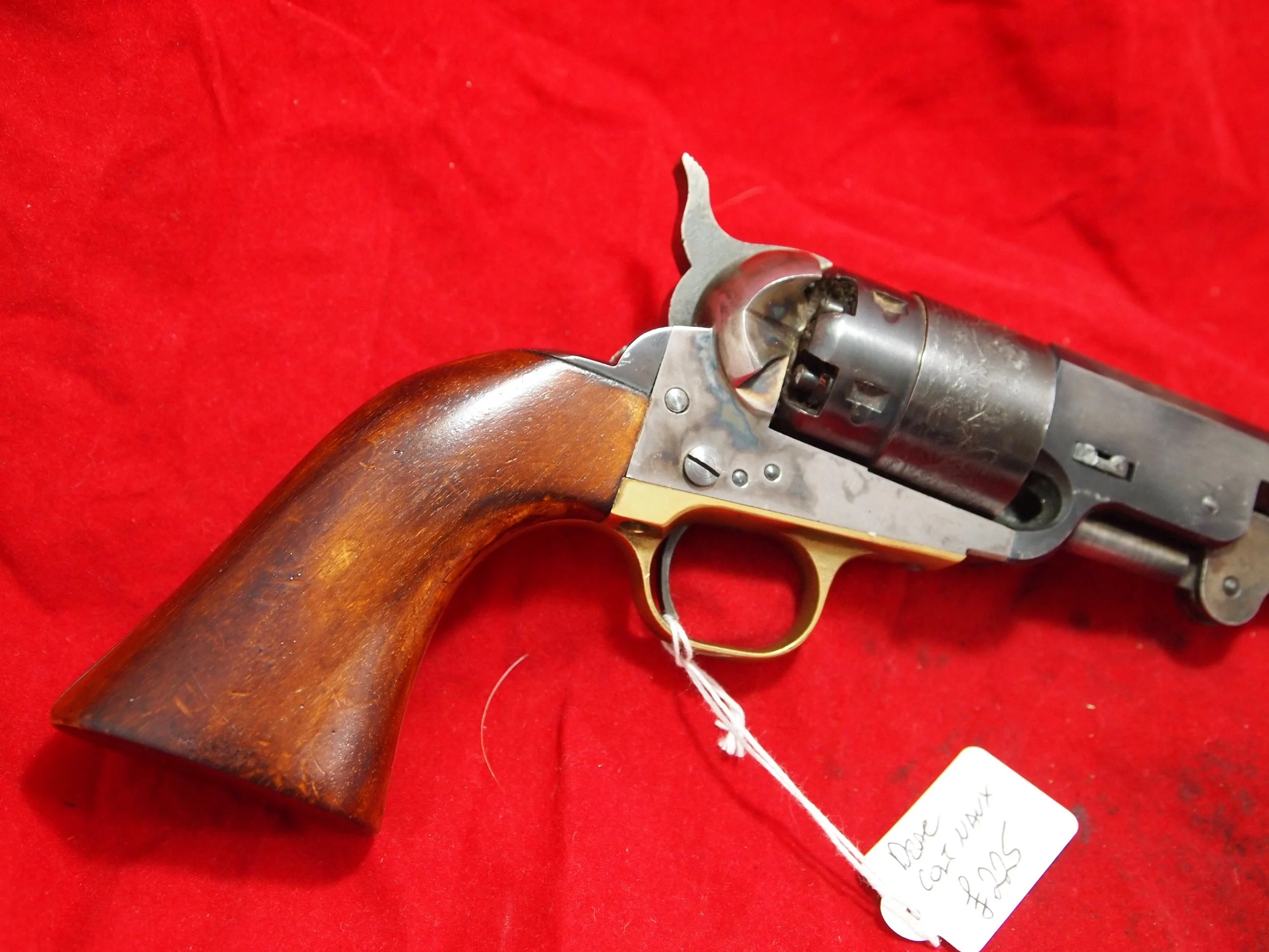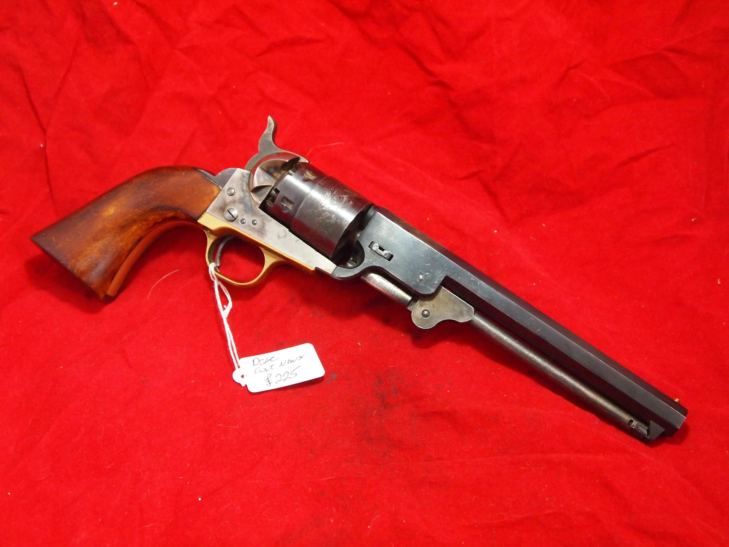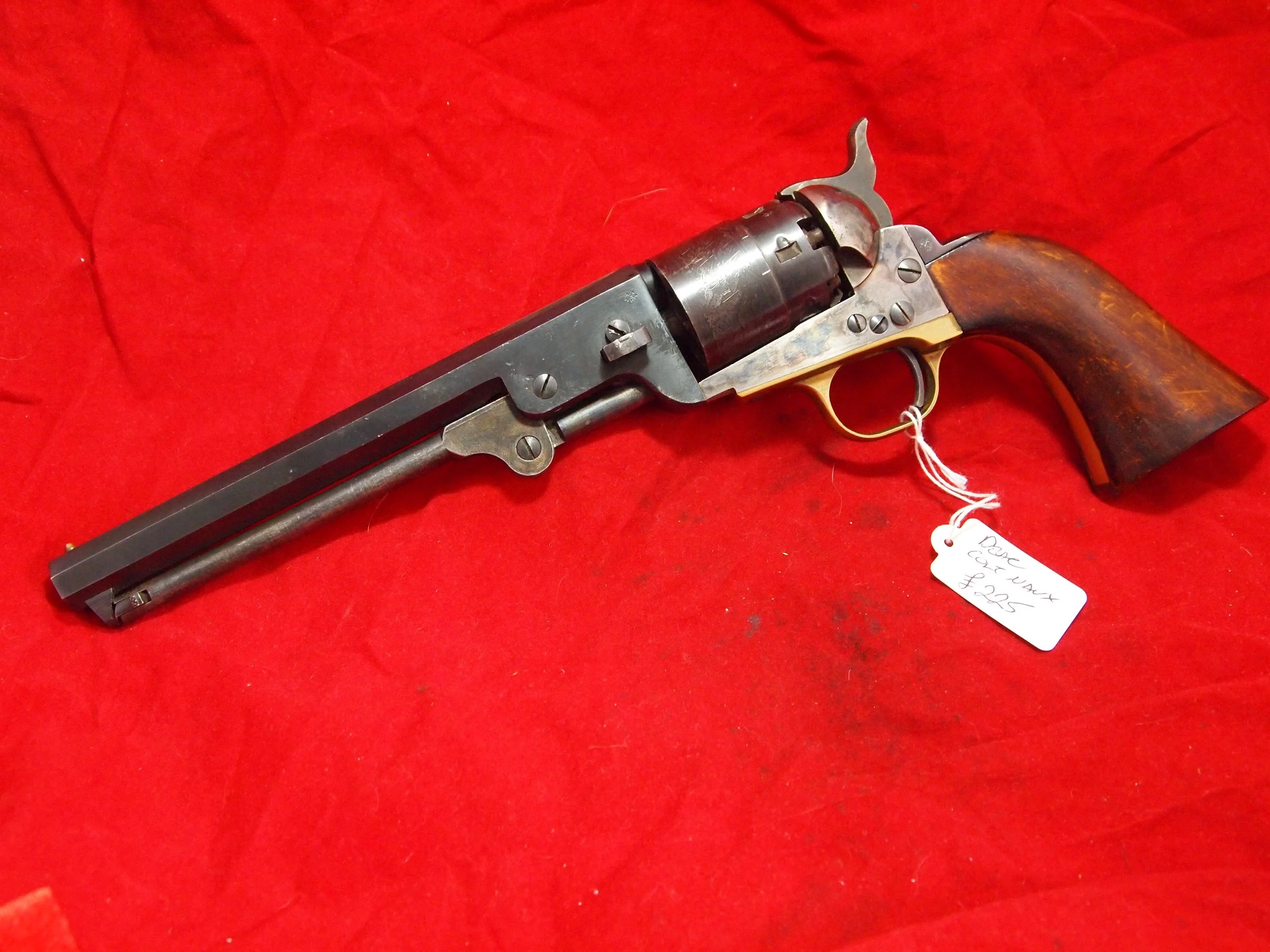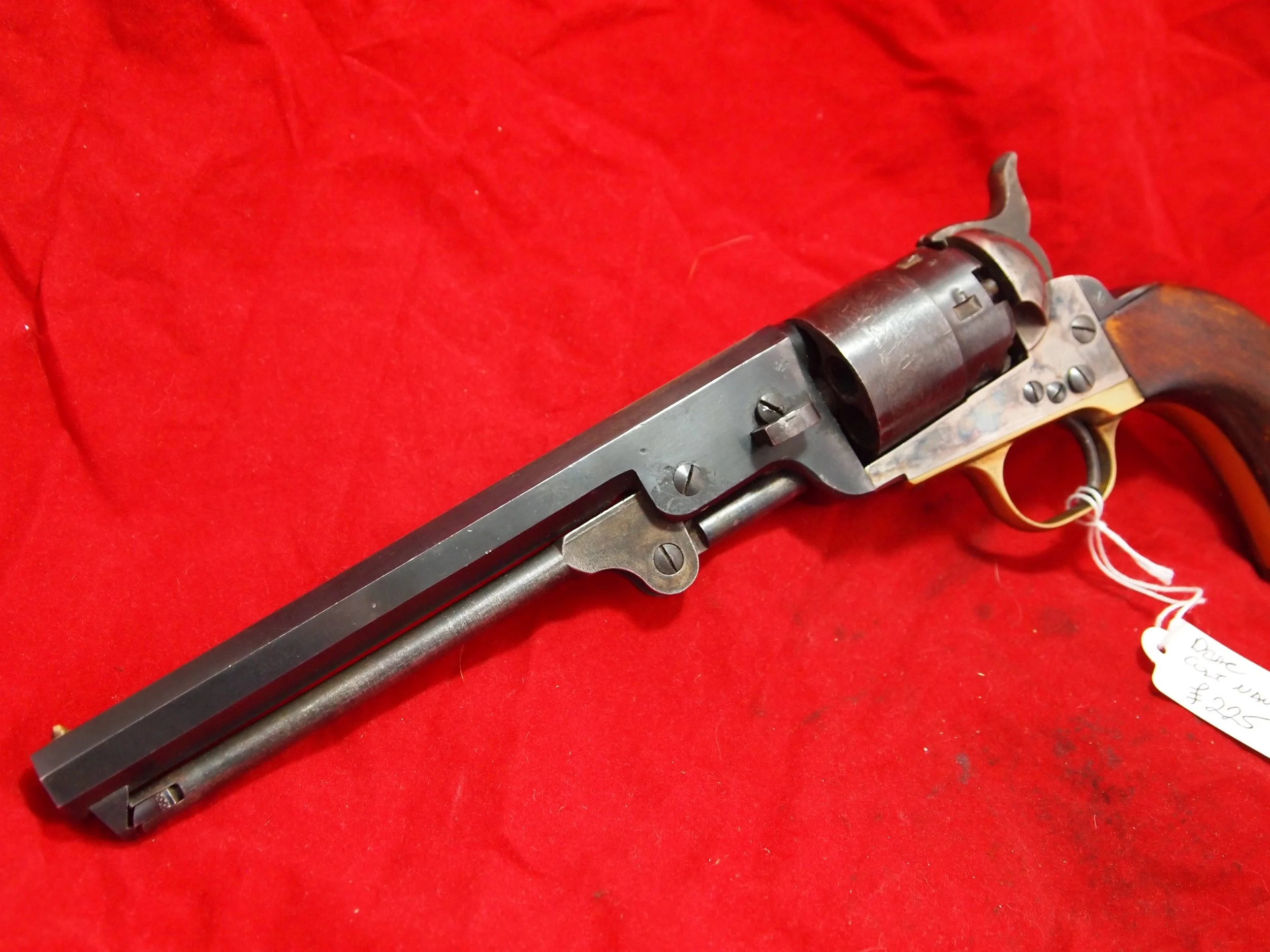 A steel framed deactivated replica of a Colt Navy. It is an older the action cocks and dry fires. The cylinder turns correctly when you cock the hammer, but it does not index very positively and the cylinder can rotate a little as the hammer drops. It has the cutaway and extended screw for the fitment of a stock. With certificate.