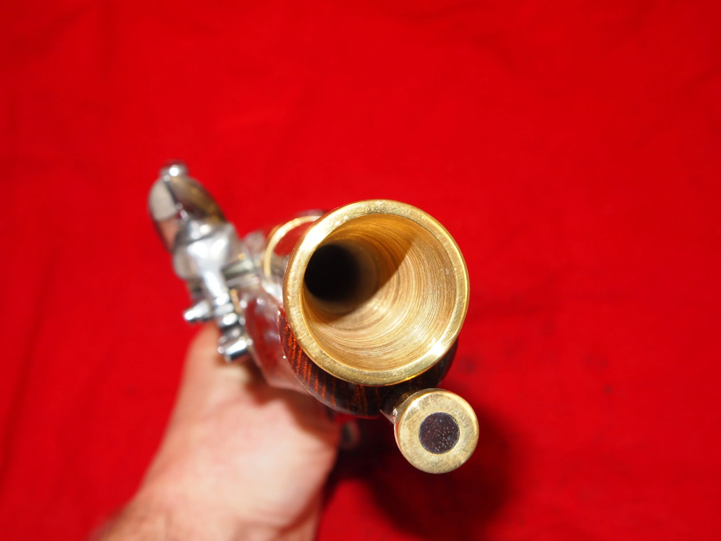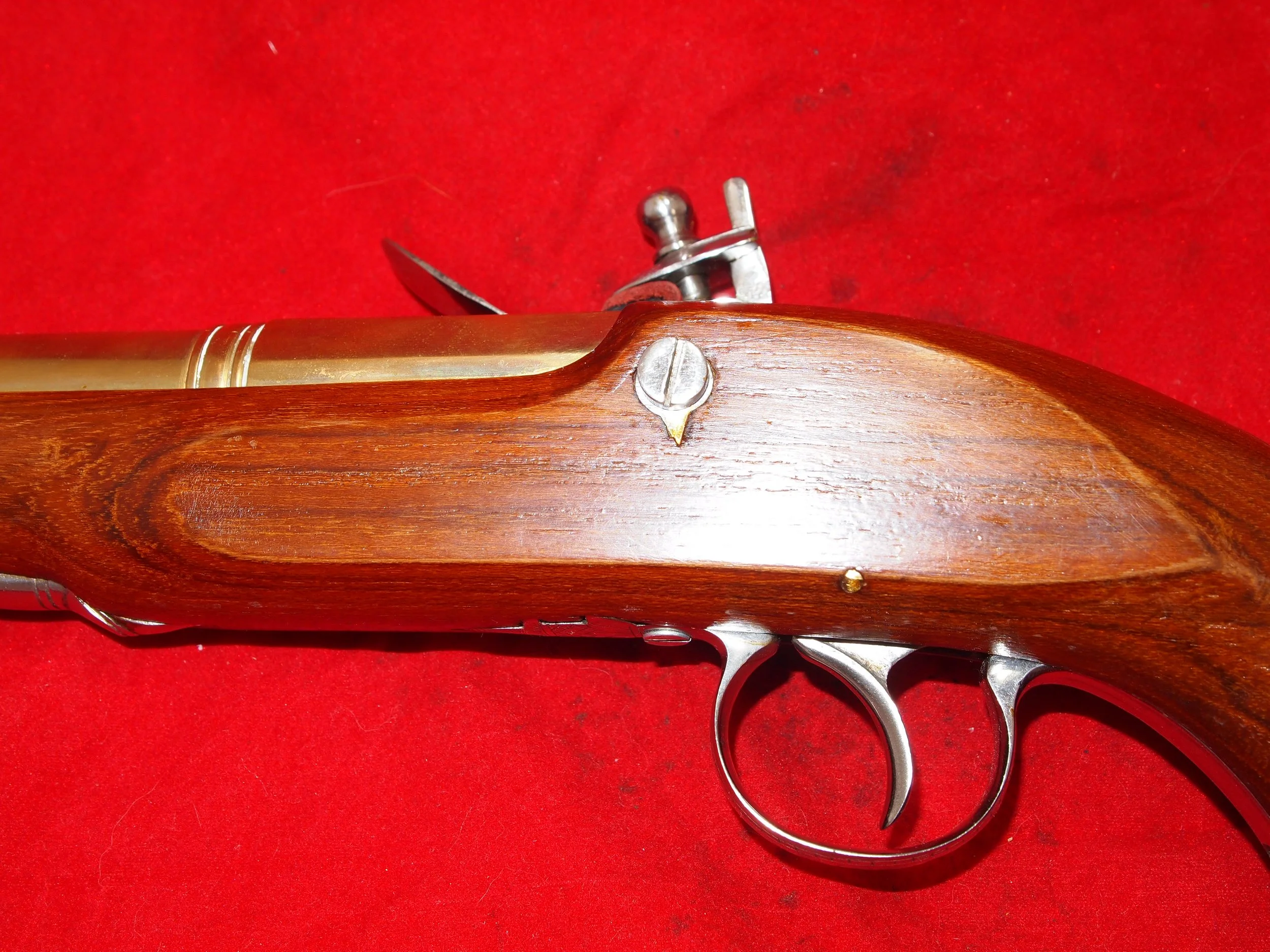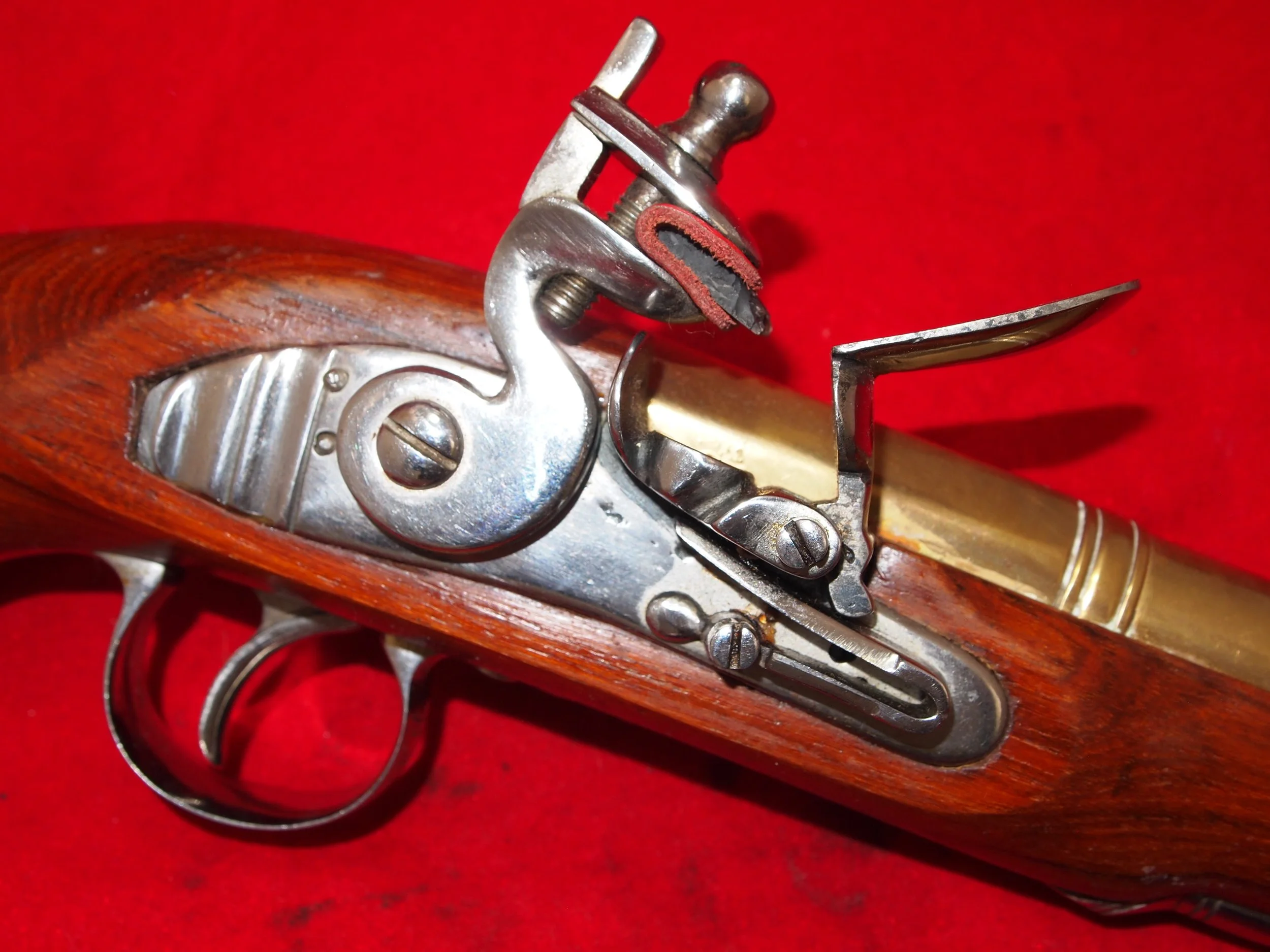 A pair of quality heavy weight replica flintlock pistols. Real wood stocks, steel flintlock actions and brass blunderbuss barrels. Both Cock and dry fire. In presentation wooden box.