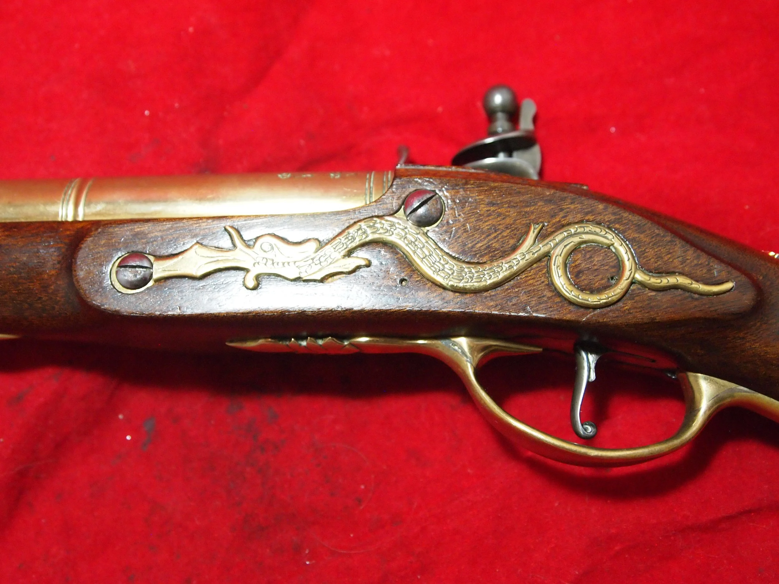 A quality heavy weight replica flintlock pistol. Real wood stock, steel flintlock action and brass barrel. Cocks and dry fire. Barrel length 12” overall length 18”.