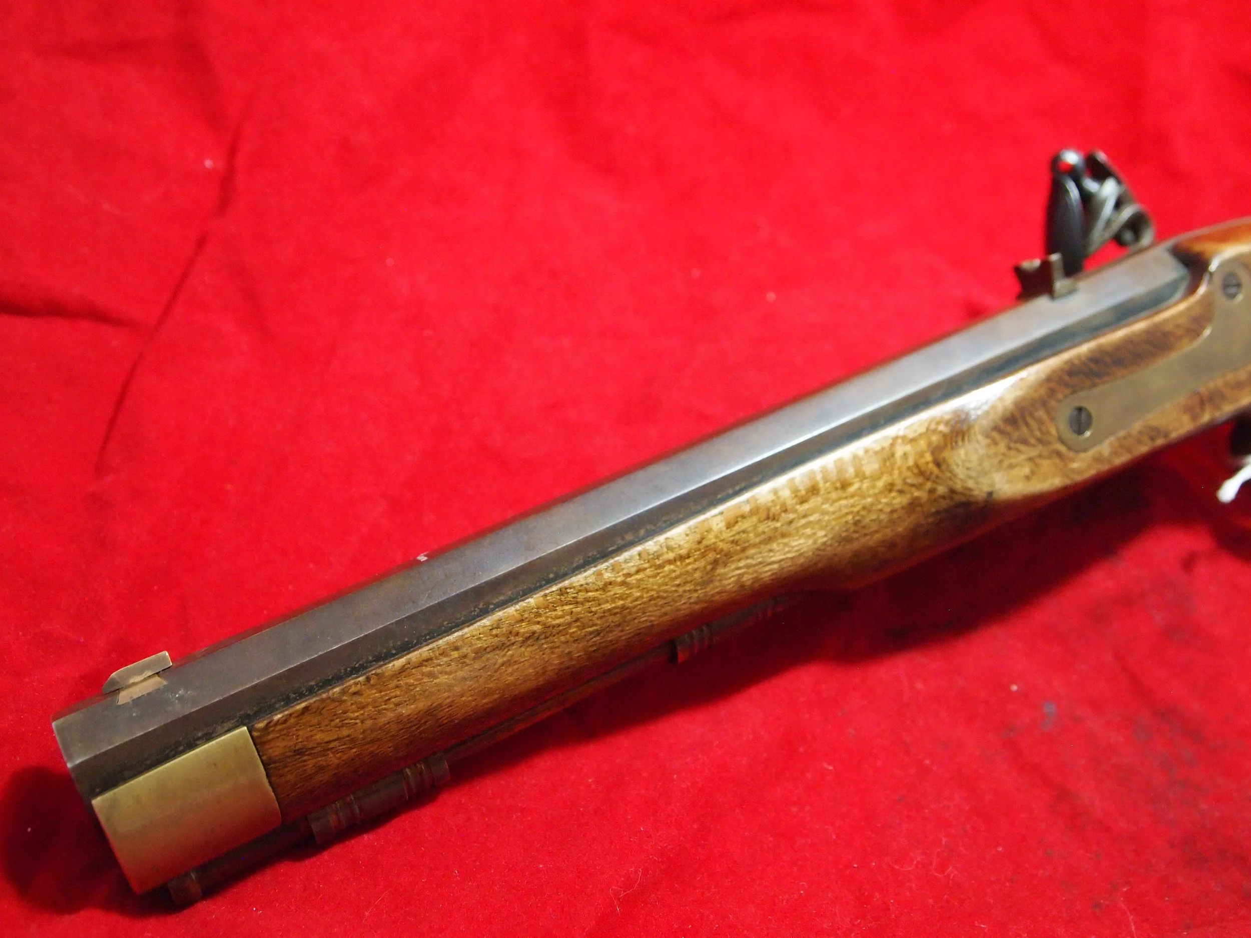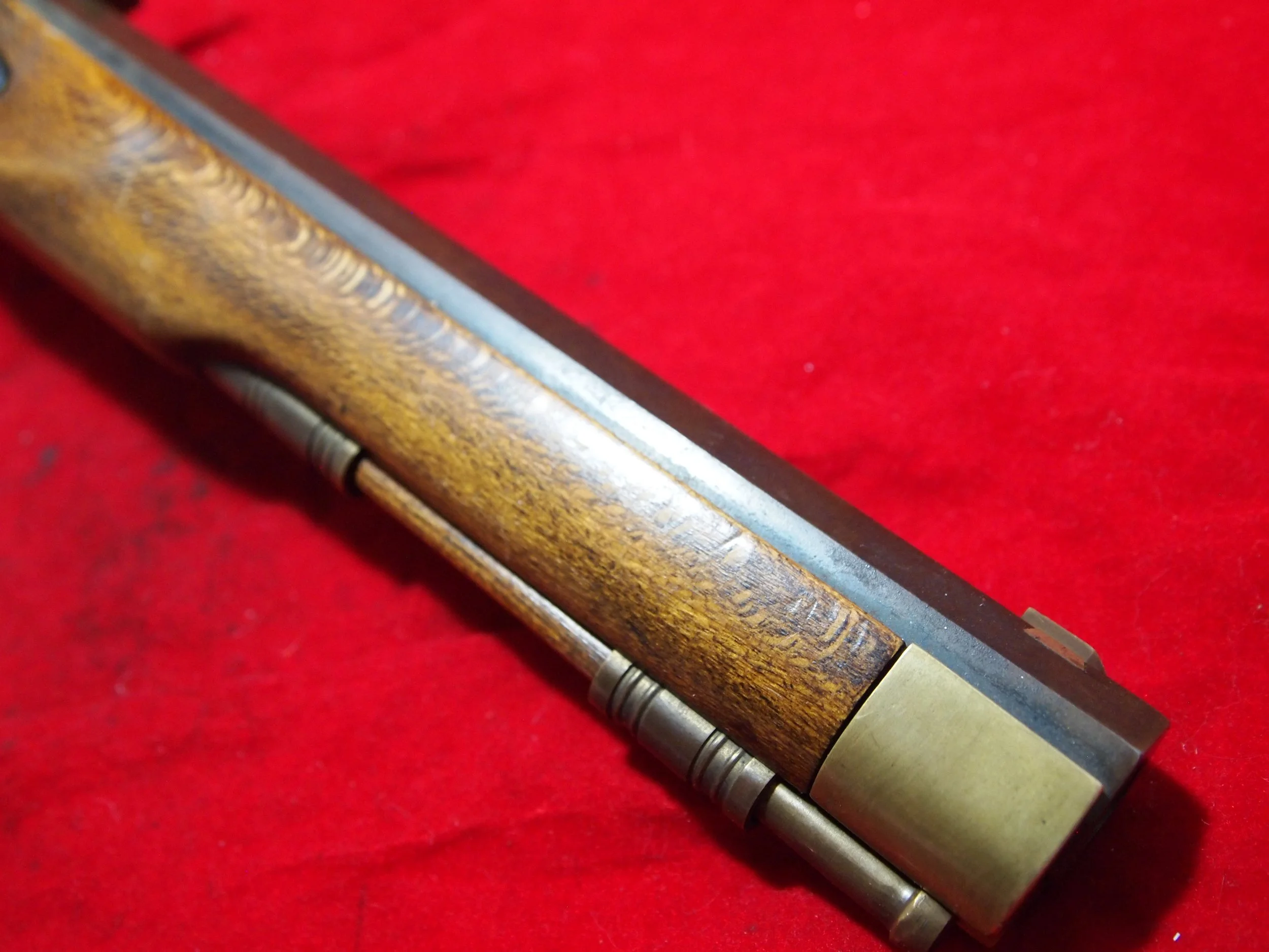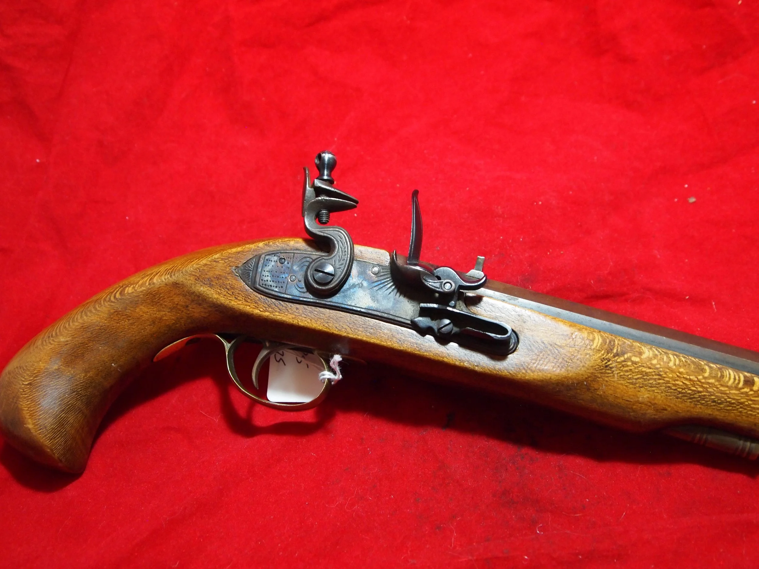A quality heavy weight replica Kentucky flintlock pistol. Real wood stock, steel flintlock action and steel barrel. Cocks and dry fire, but with a hair trigger! Barrel length 8” overall length 16”.