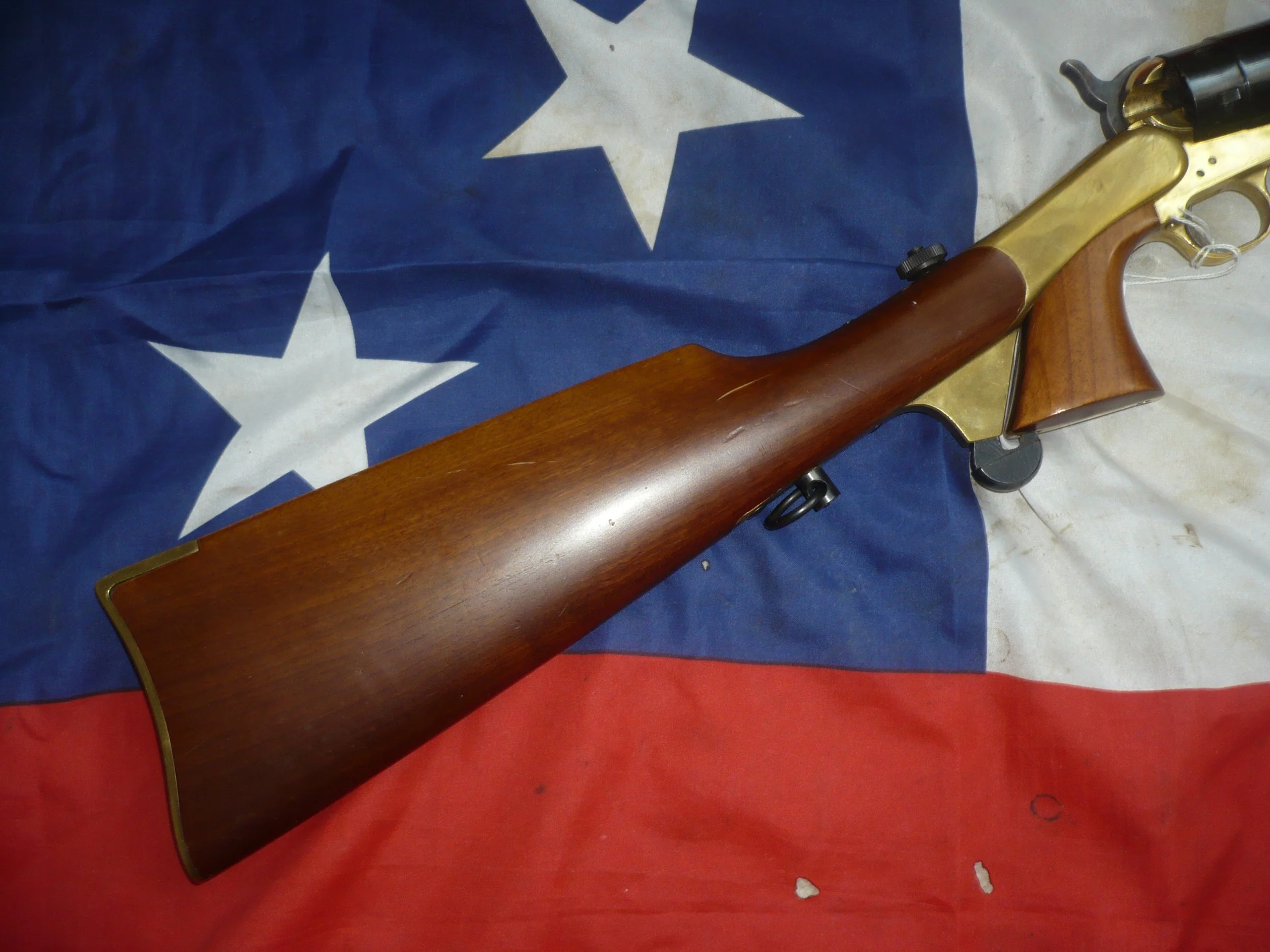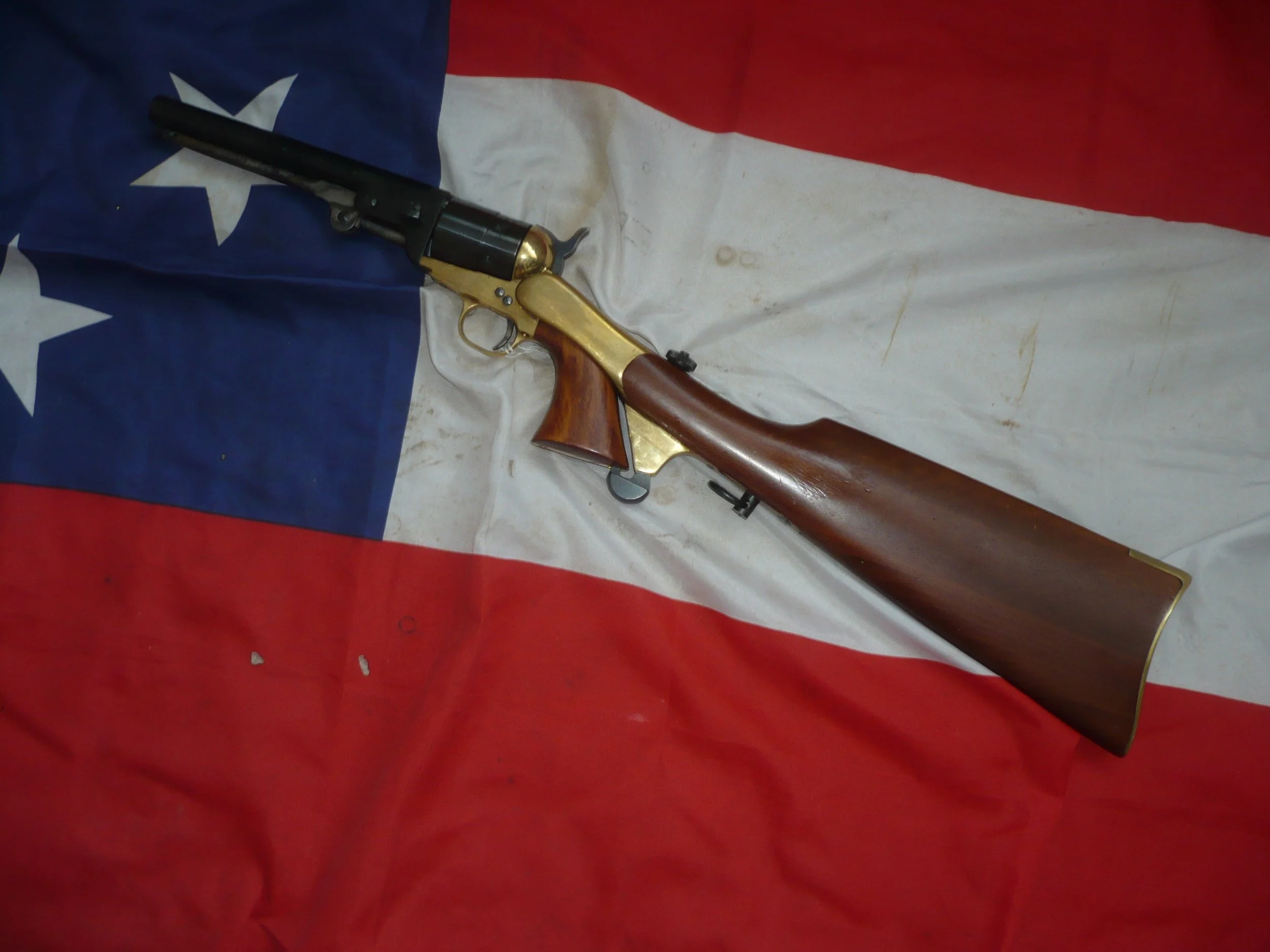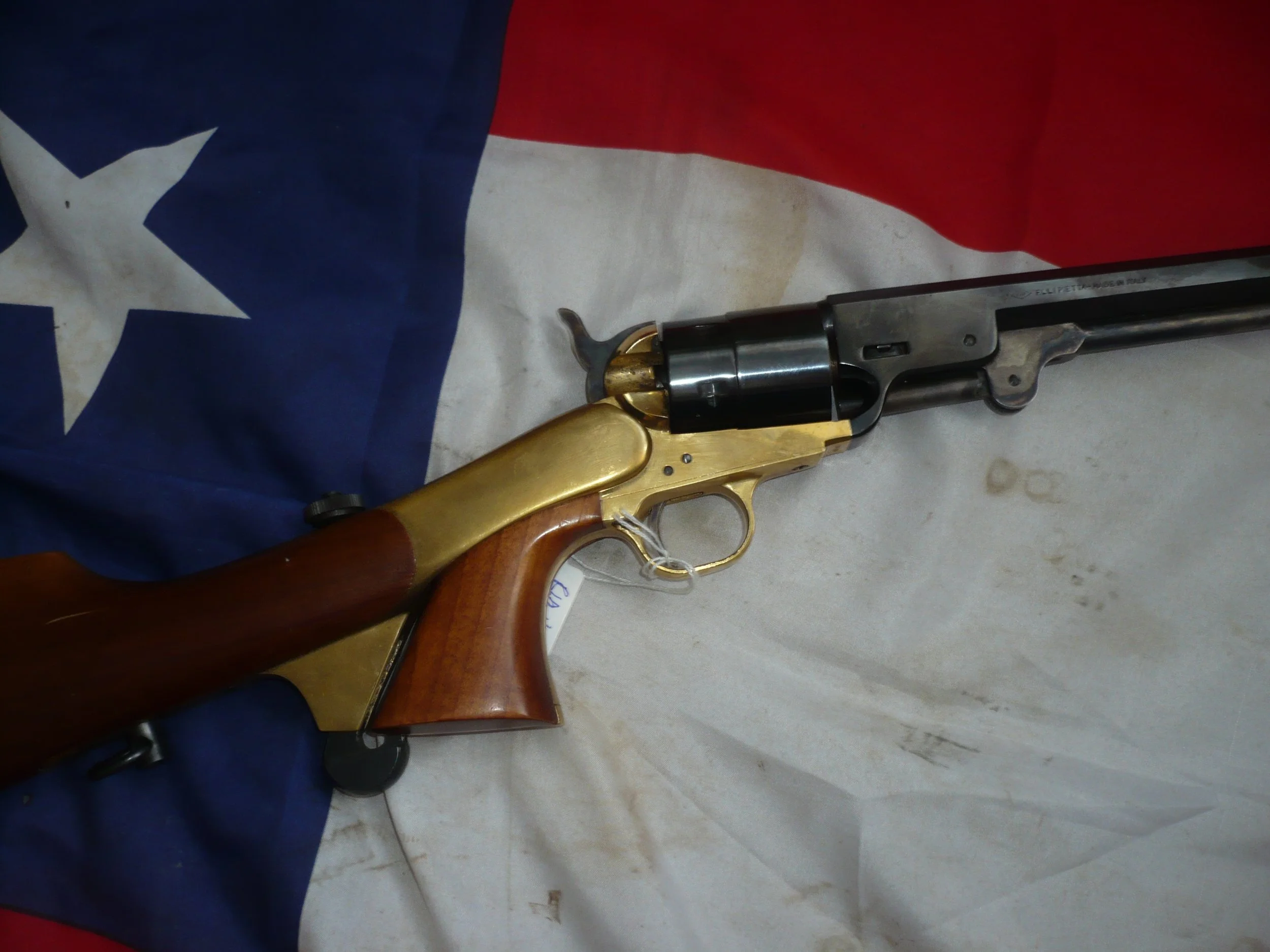 This is a very nice brass framed 9mm Pietta Colt Navy. It has a good action and trigger and is side venting under the front of the barrel. This pistol is in good condition with blueing to the barrel and cylinder. What makes this pistol really great it that is has the correctly fitting Pietta shoulder stock with the correct elongated hammer screw and cutaway in the base of the pistol grip.