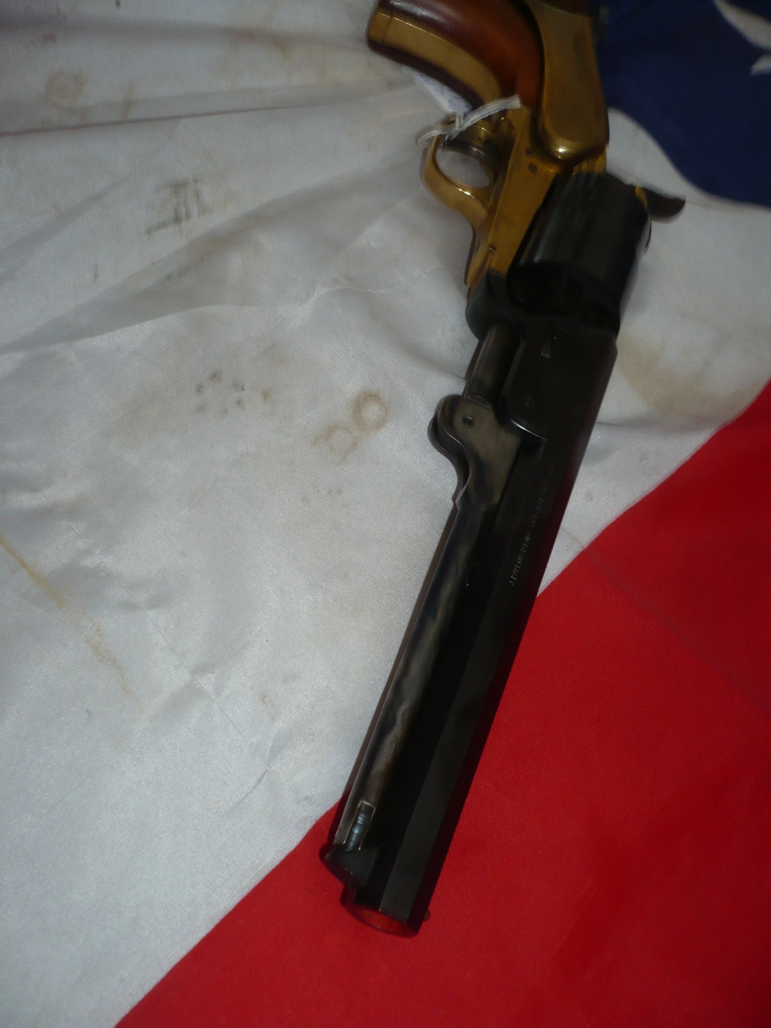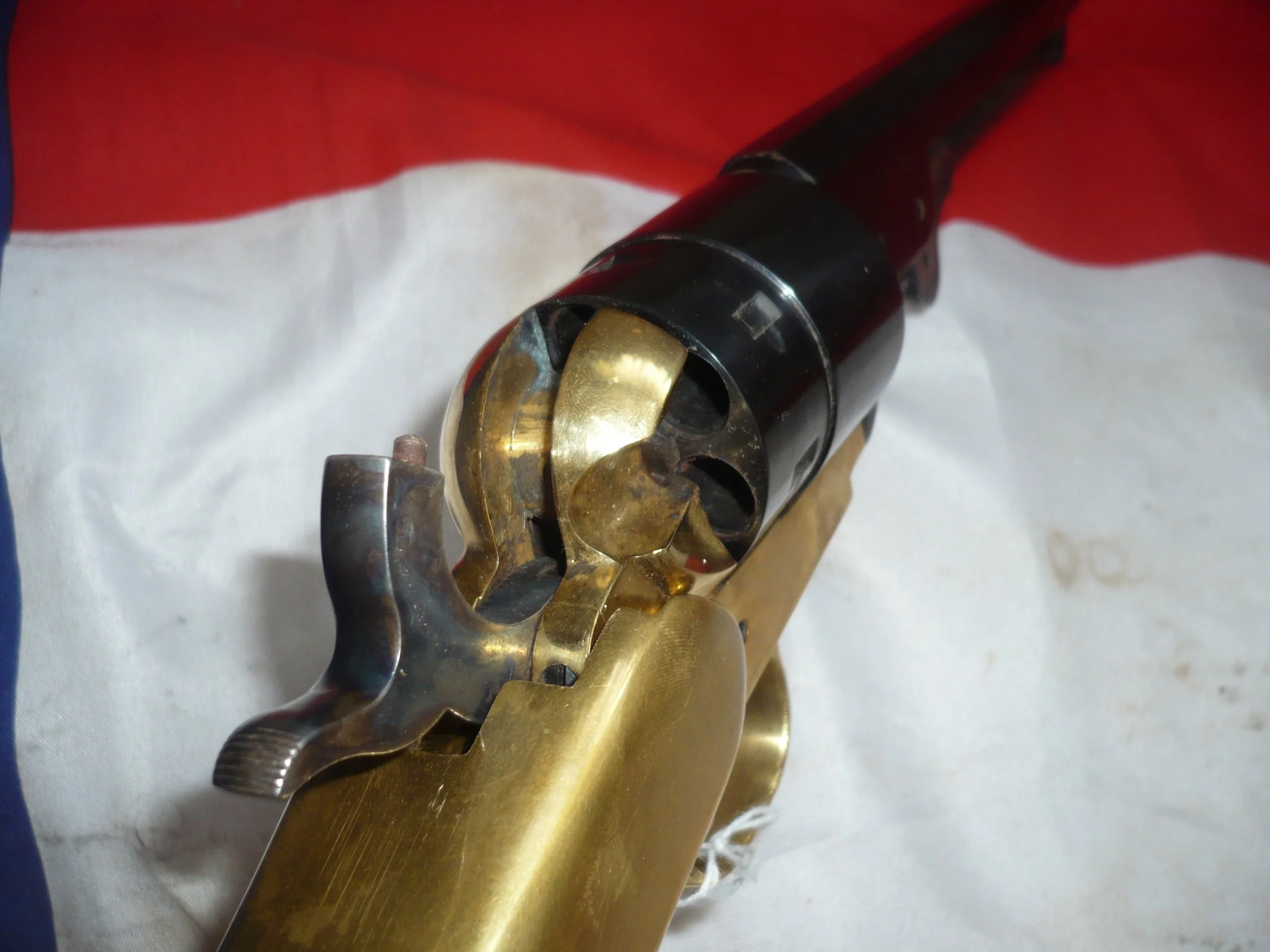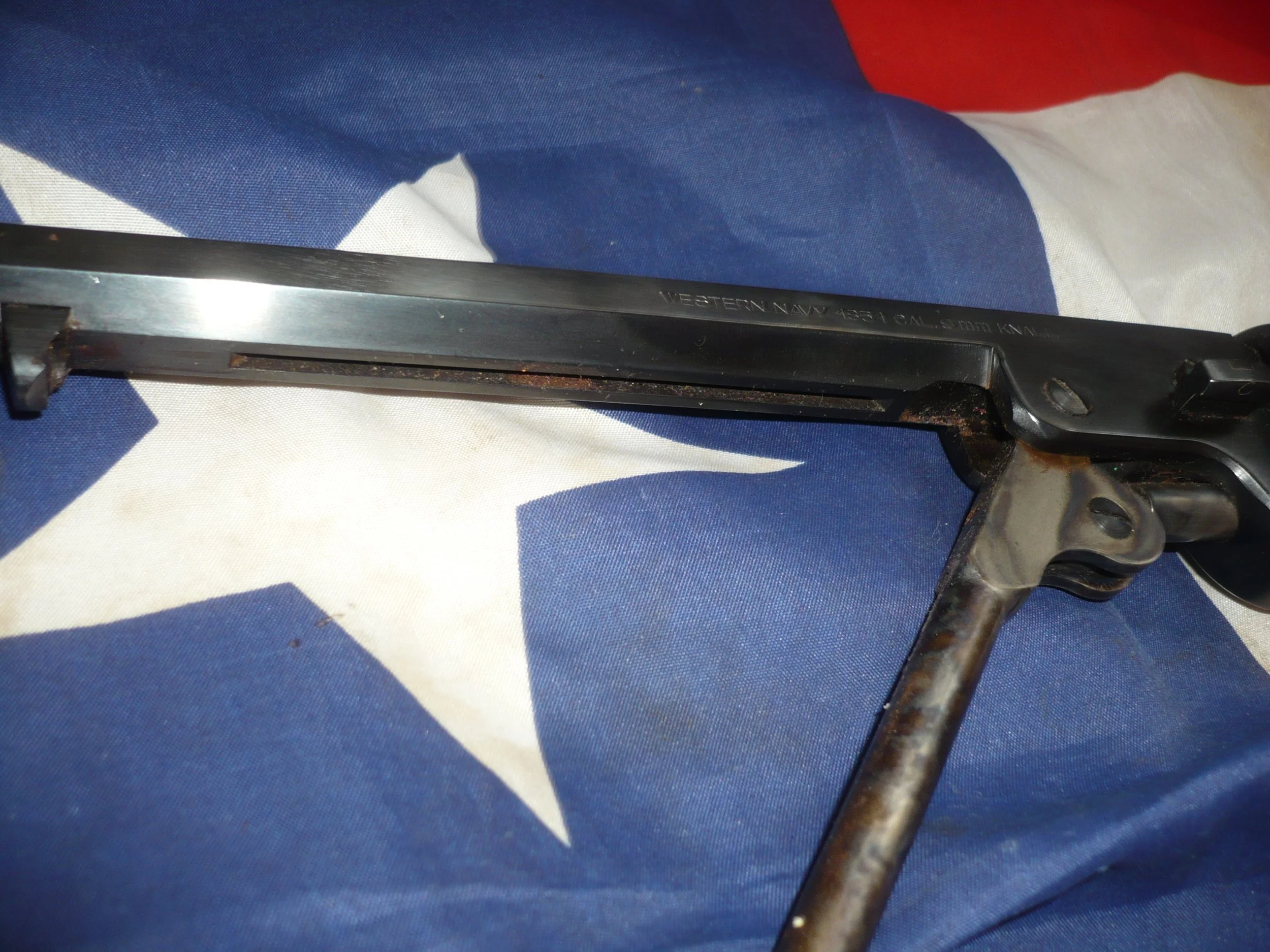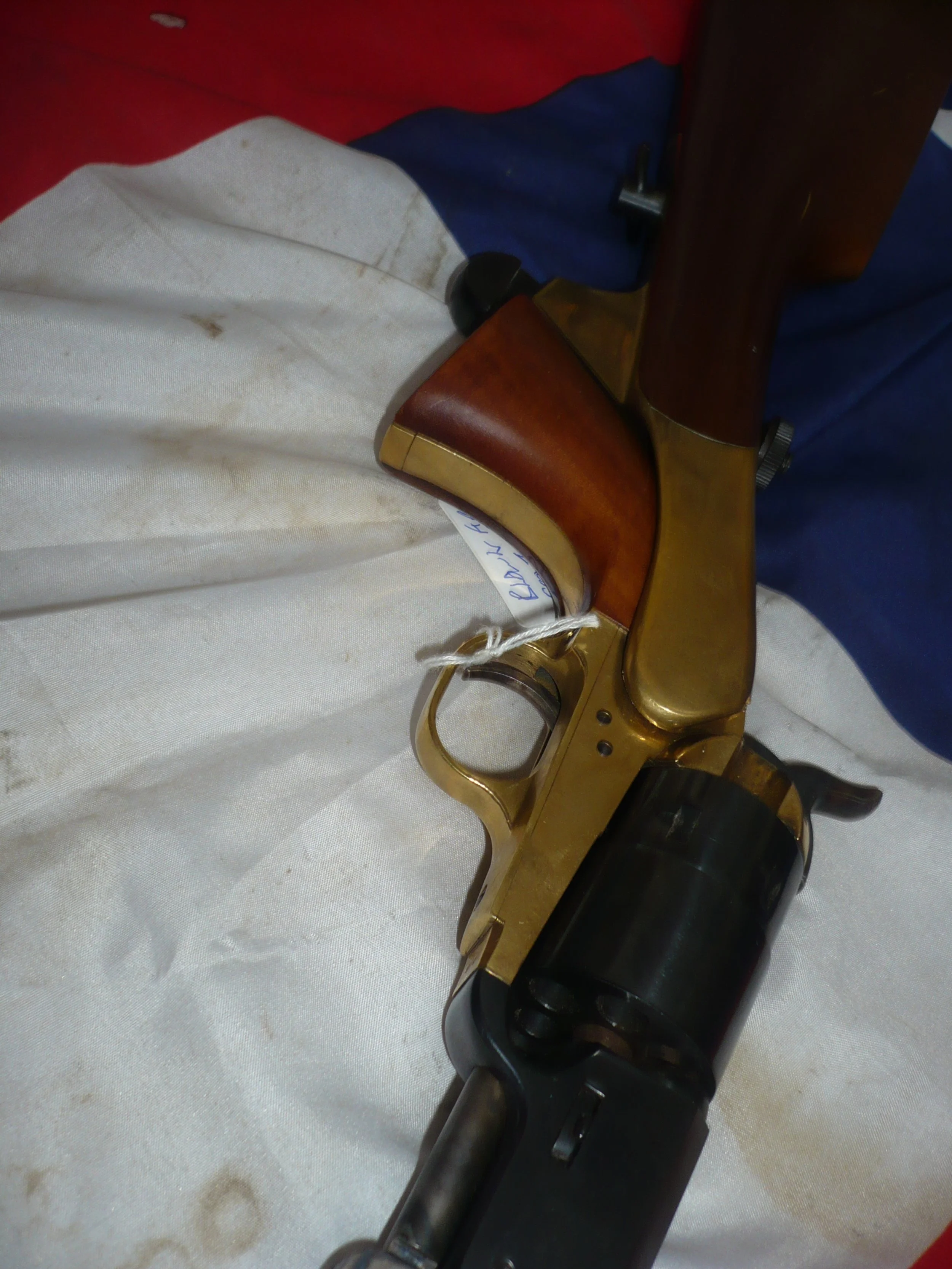 This is a very nice brass framed 9mm Pietta Colt Navy. It has a good action and trigger and is side venting under the front of the barrel. This pistol is in good condition with blueing to the barrel and cylinder. What makes this pistol really great it that is has the correctly fitting Pietta shoulder stock with the correct elongated hammer screw and cutaway in the base of the pistol grip.