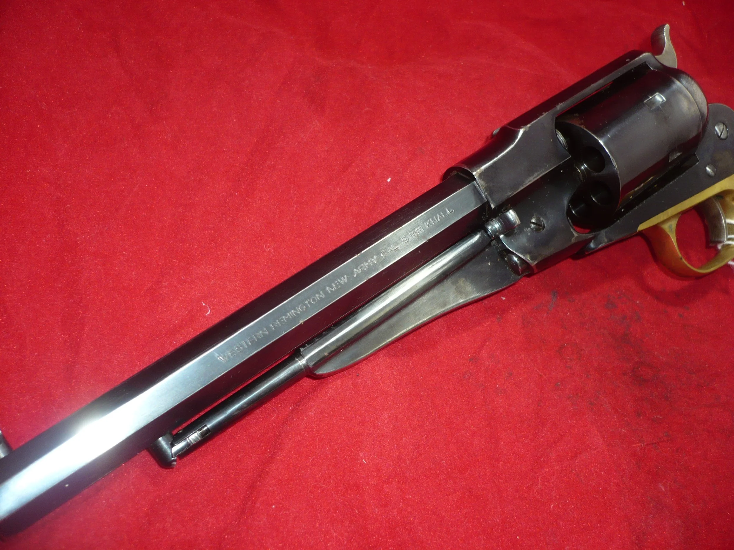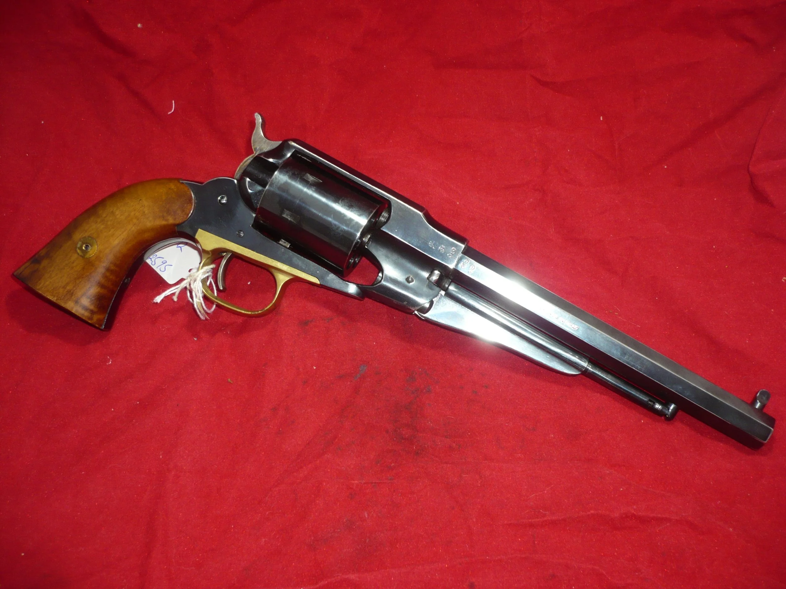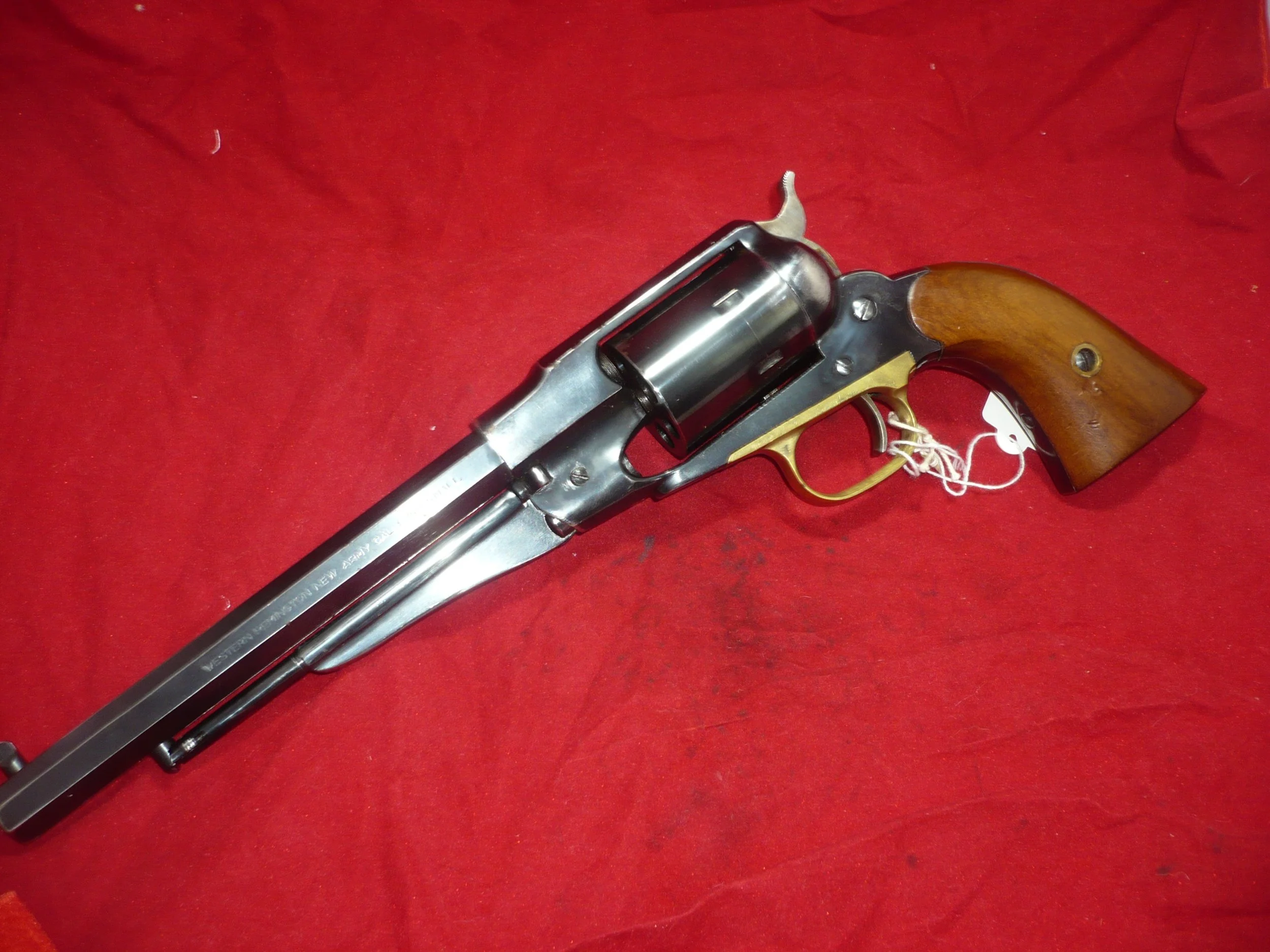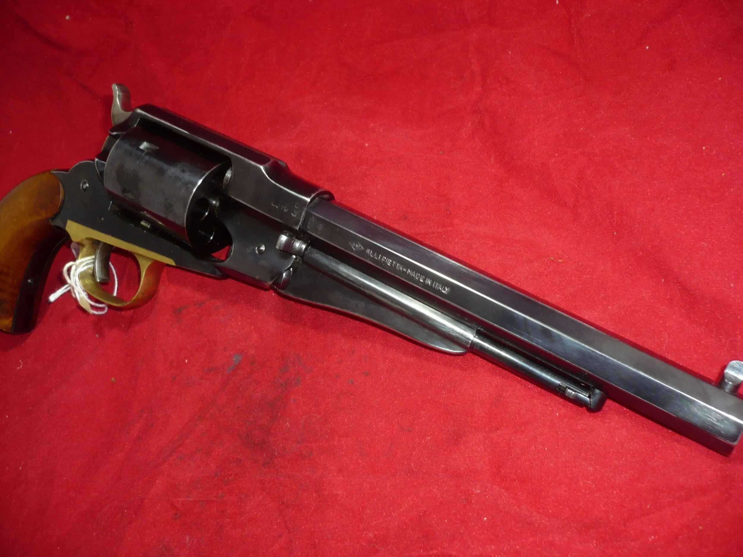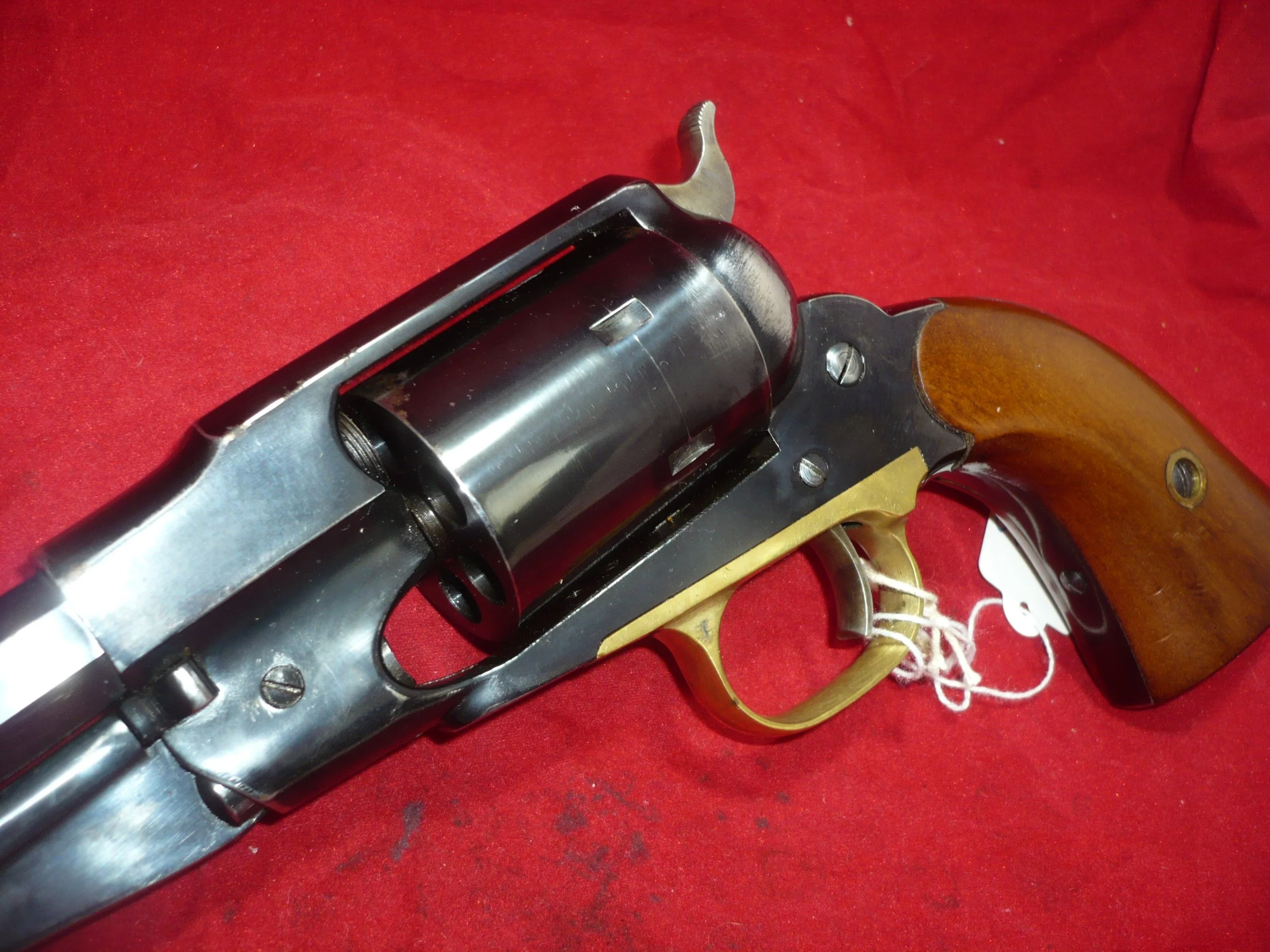 A vgc solid steel frame Pietta Remmington, 9mm blank fire pistol. It has a good action and trigger and is side venting under the front of the barrel. The finish is good.