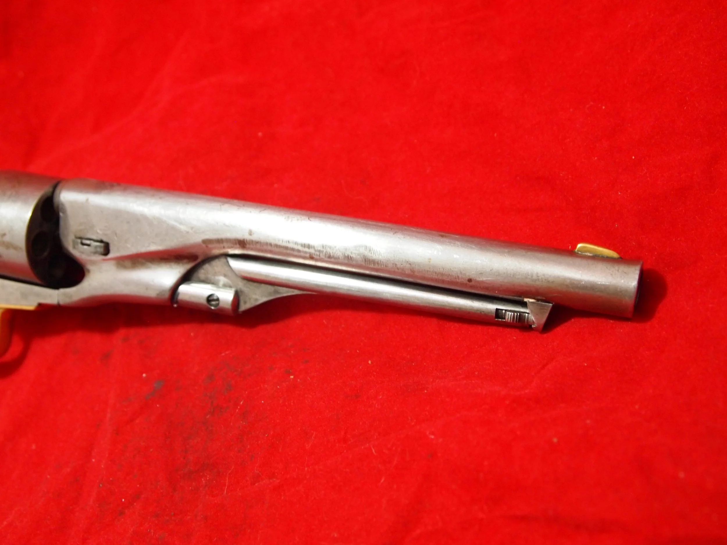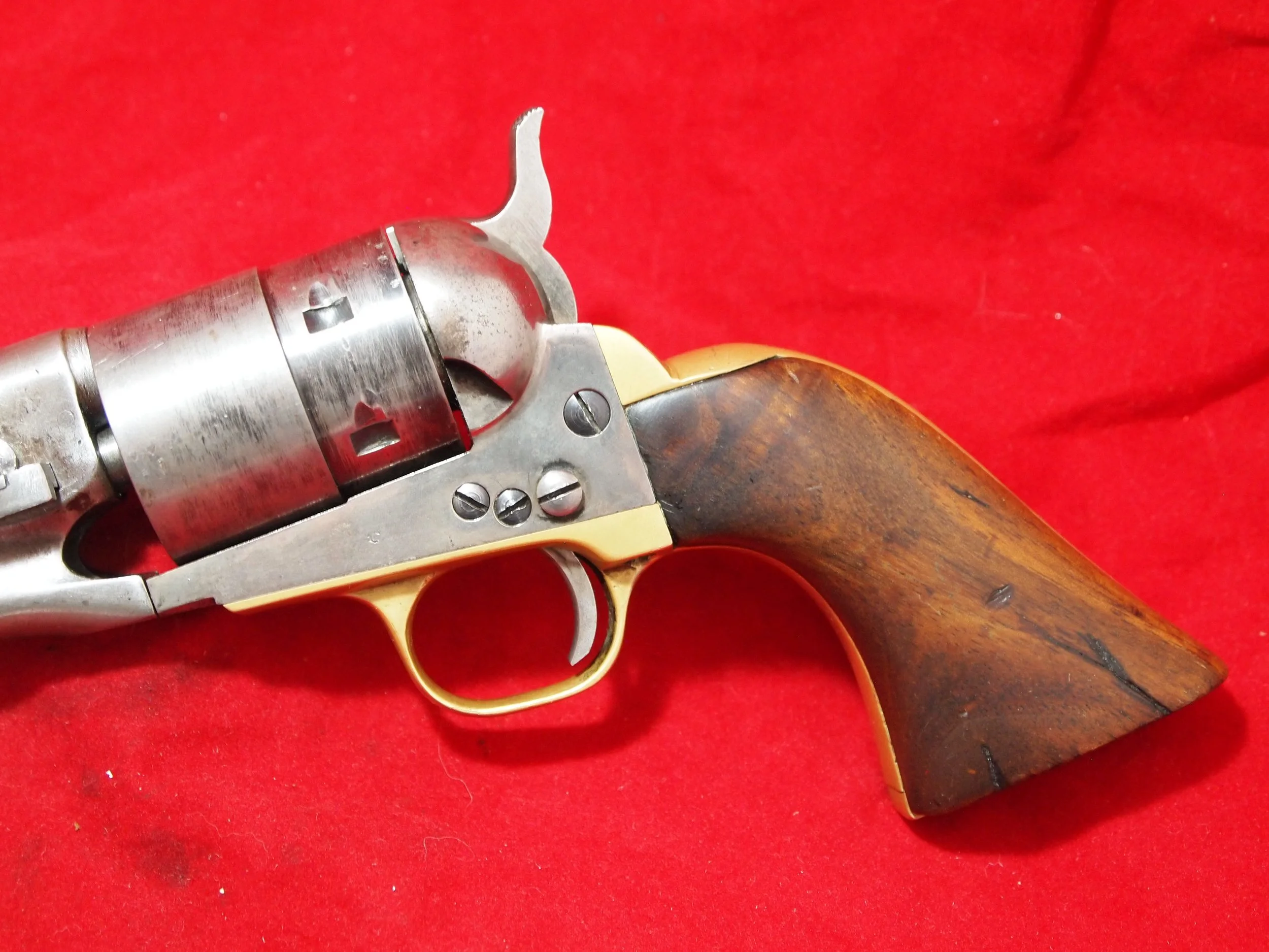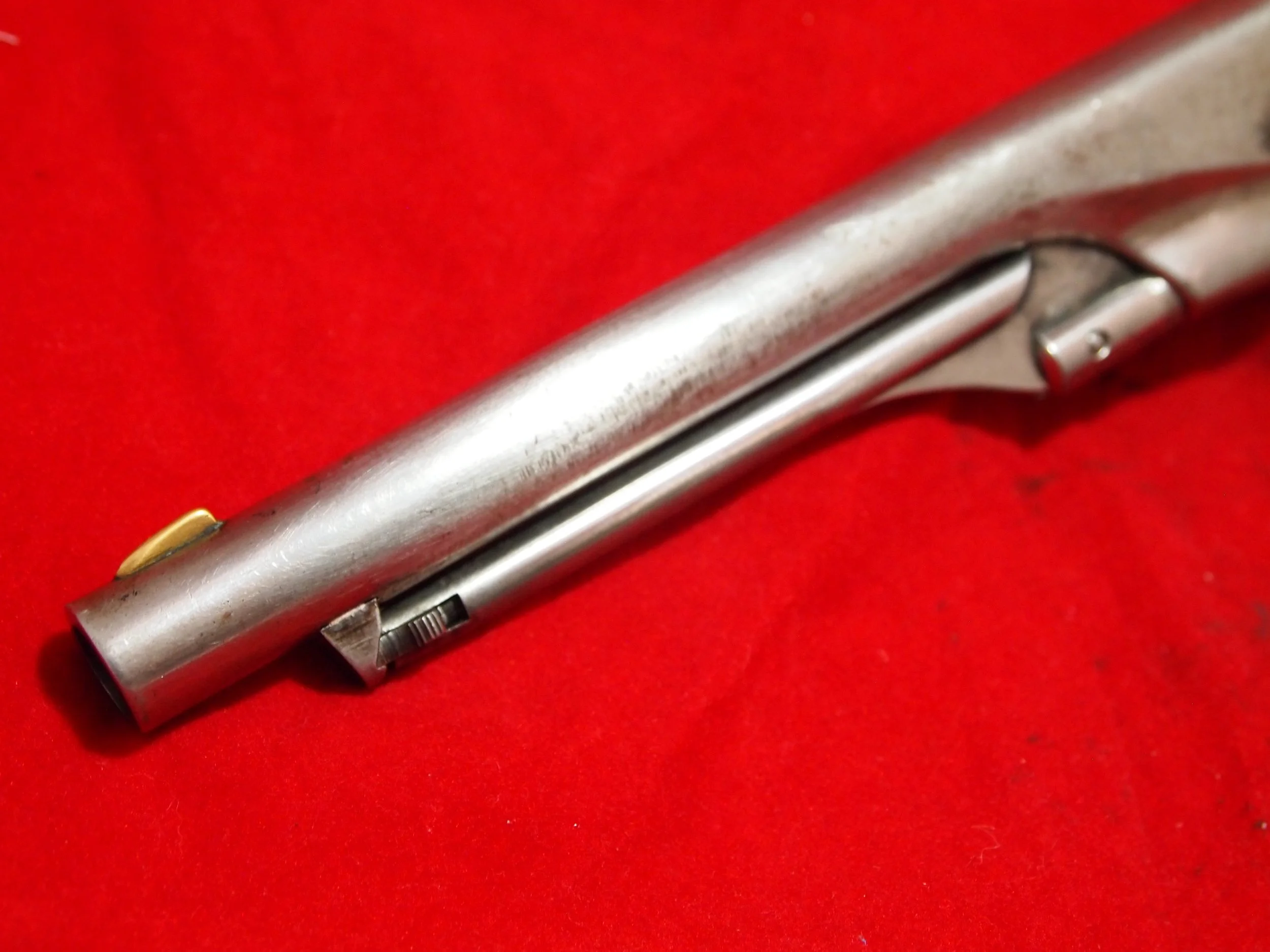 This is a steel framed Colt Army 9mm blank fire FV pistol. It has a good action and trigger, and has a trinity style pepper pot front baffle and a restriction for the rear baffle. Fully strippable. It has a great period feel to its patina with some “tack work” on one side of the grip.