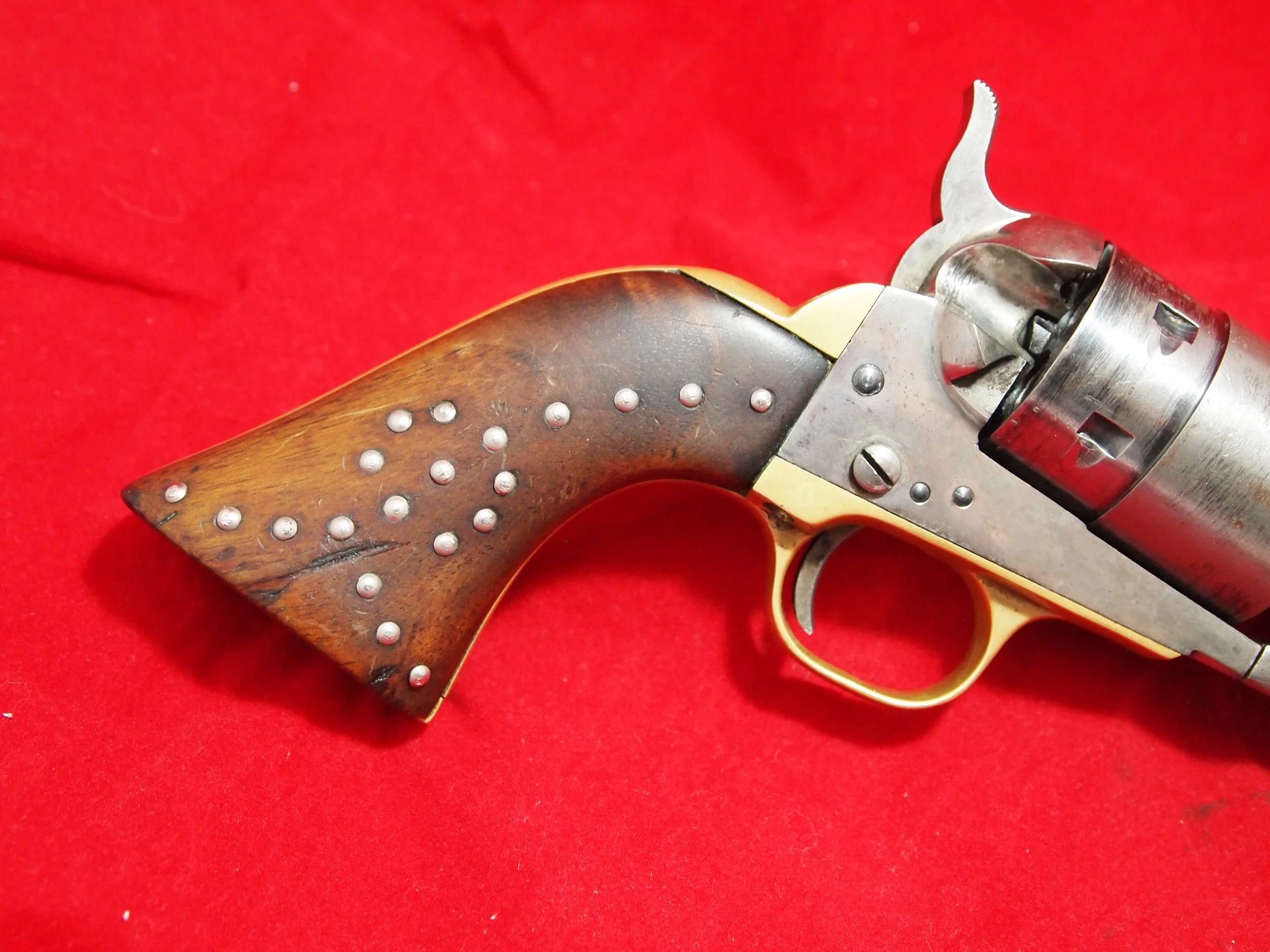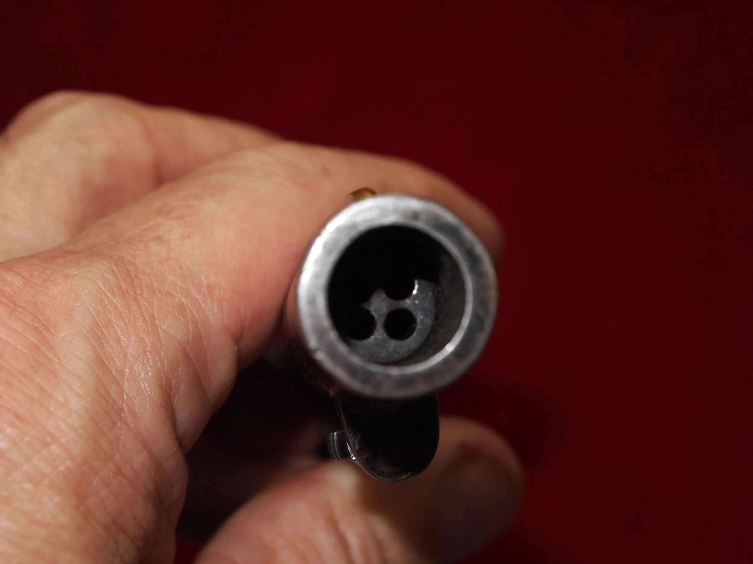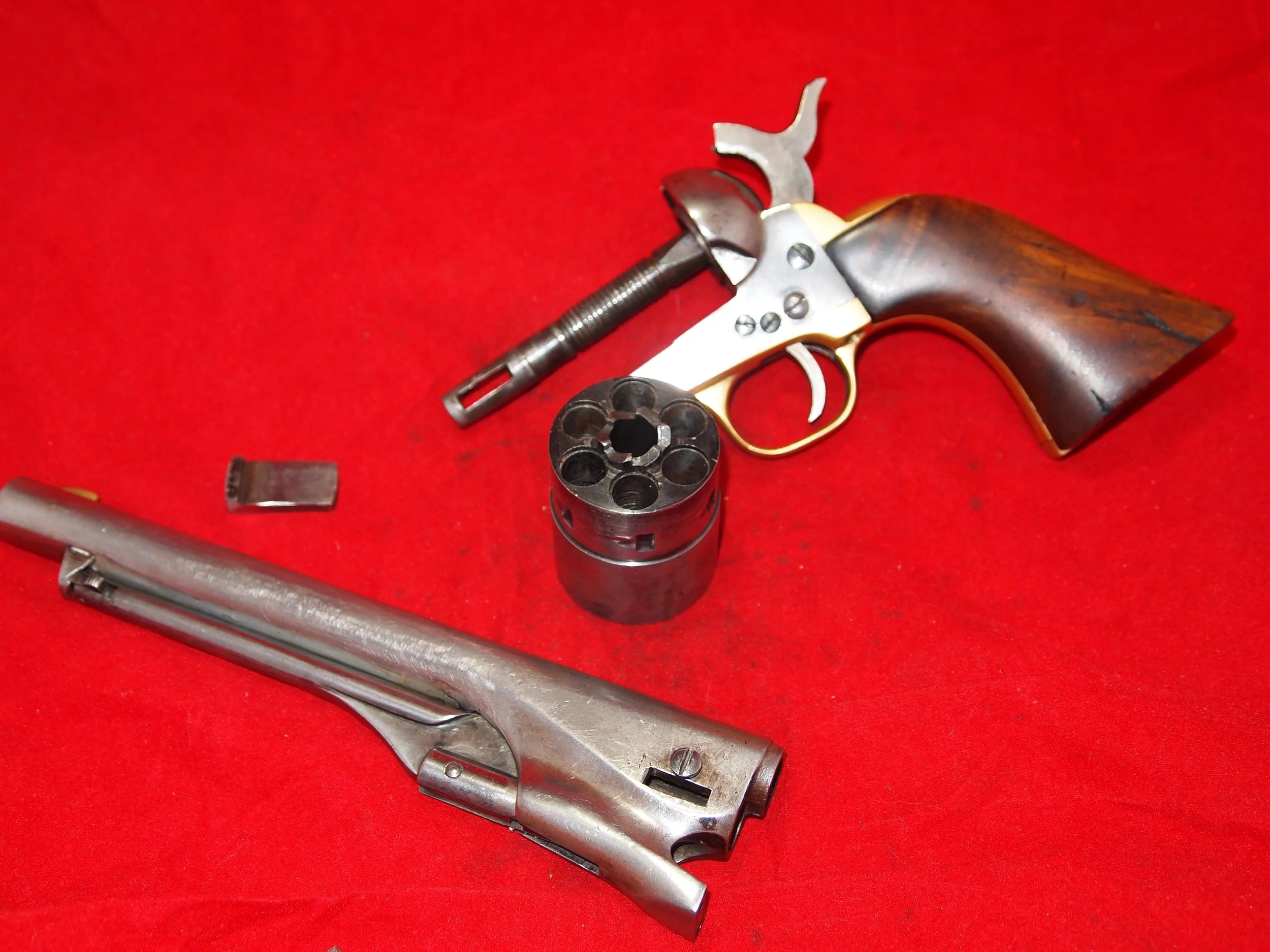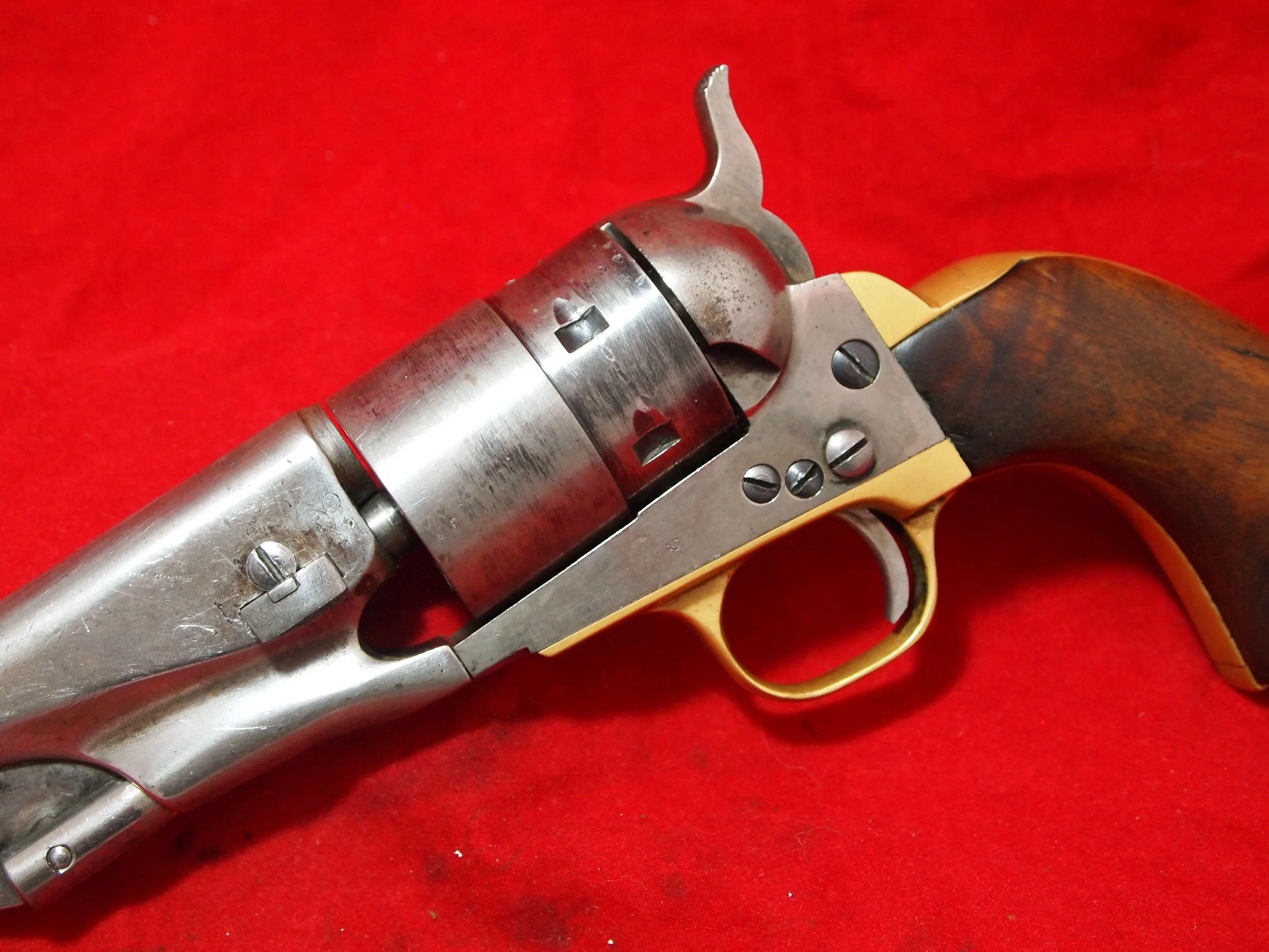 This is a steel framed Colt Army 9mm blank fire FV pistol. It has a good action and trigger, and has a trinity style pepper pot front baffle and a restriction for the rear baffle. Fully strippable. It has a great period feel to its patina with some “tack work” on one side of the grip.
