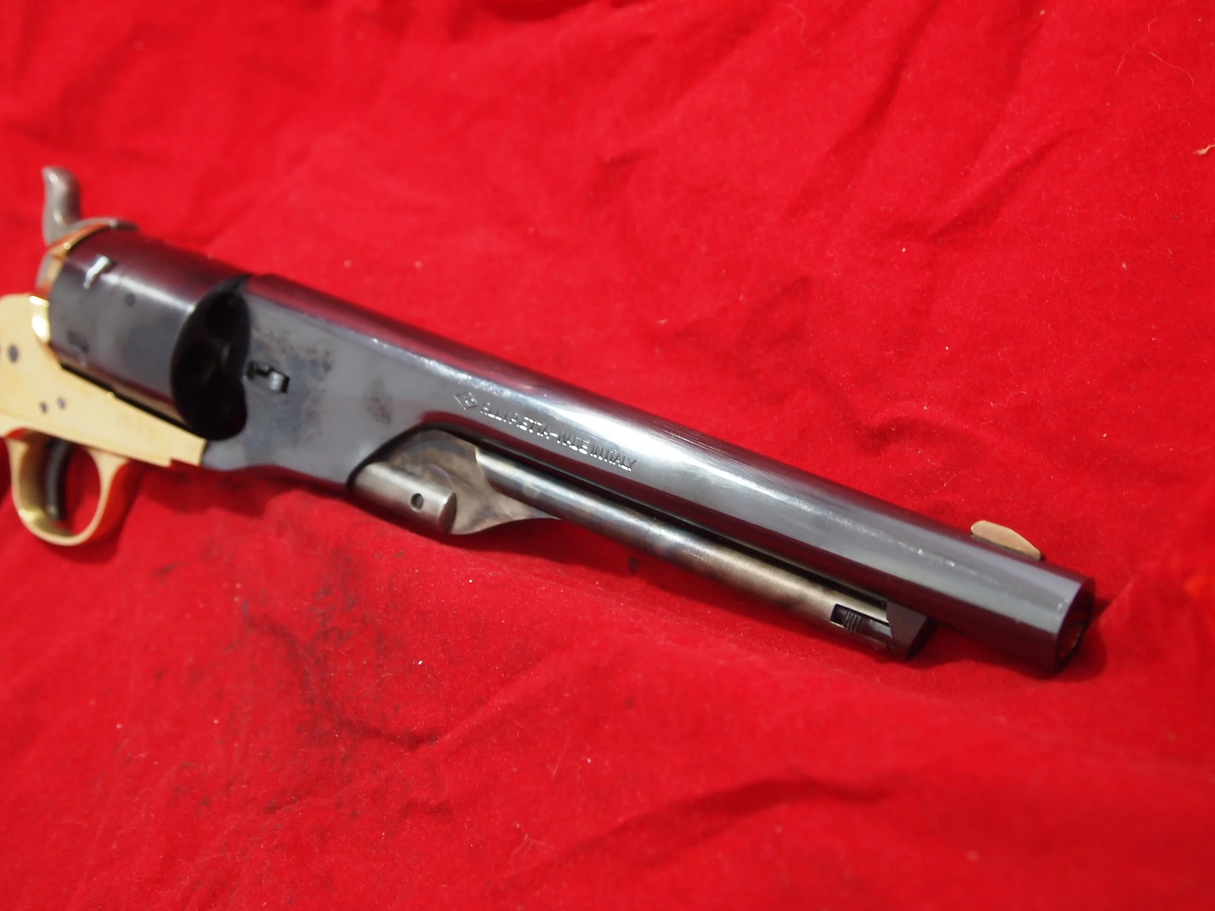 This is a brass framed Colt 9mm blank fire pistol. It has a good action and trigger, and is side venting. Hardly used.